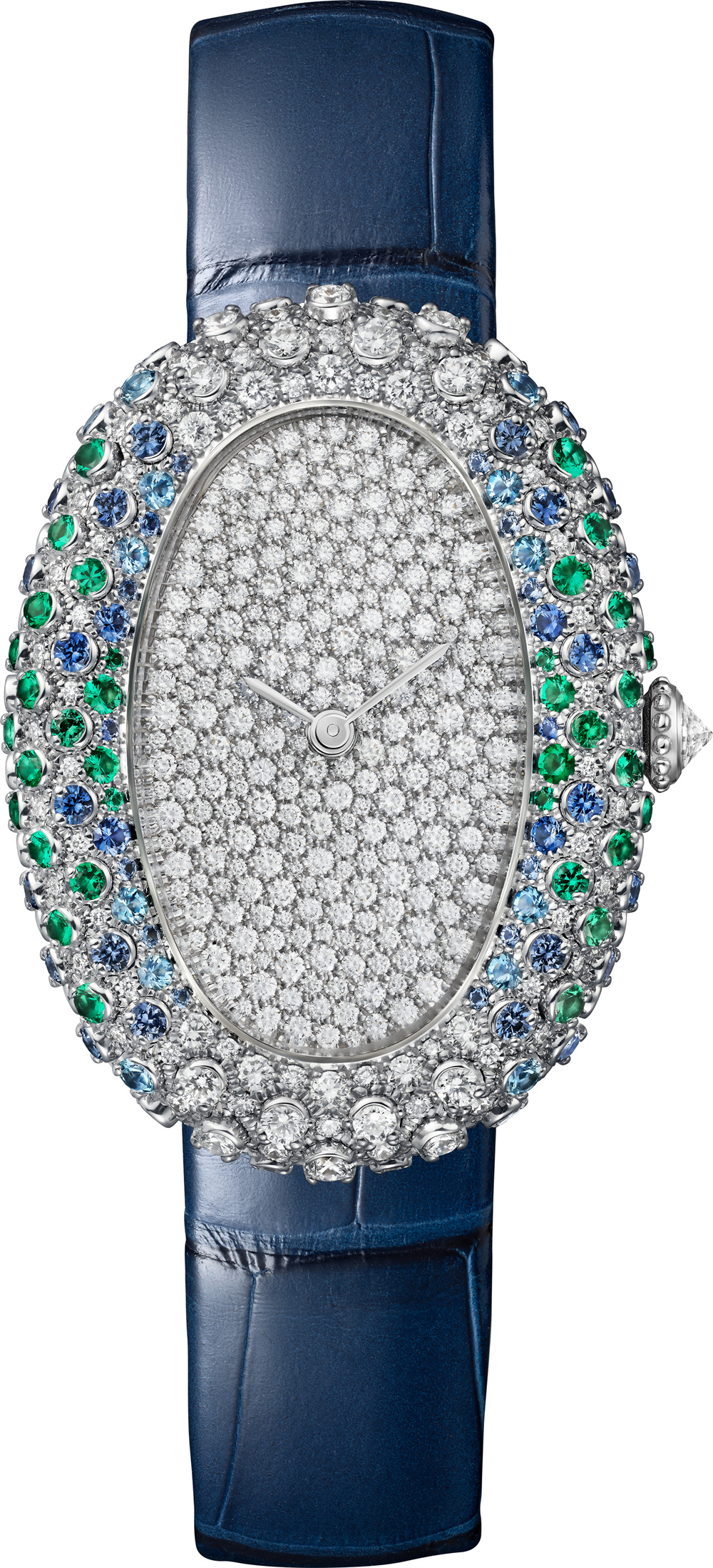 卡地亚将Baignoire腕表的标志性椭圆造型与品牌经典的蓝、绿配色相结合——路易·卡地亚(Louis Cartier)称之为“孔雀图案”。表壳上的宝石采用新颖而复杂的镶嵌工艺,营造出错落有致的层叠效果。这一立体设计更加凸显其170颗钻石、58颗蓝宝石、54颗祖母绿和16颗海蓝宝石的耀眼光彩。表盘整体以“雪花式”镶嵌工艺缀以262颗明亮式切割圆钻,赋予表盘灵动变幻的光芒。蓝色漆面鳄鱼皮表带搭配针扣式表扣,其上镶嵌21颗明亮式切割圆钻。